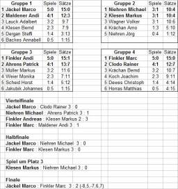 Einen schönen Jahresabschluss feierten wir am Samstag in der Schulturnhalle. Zunächst wurden die Vereinsmeisterschaften 2015 ausgespielt. Marco Jäckel konnte sich im Finale mit 3:2 gegen Marc Finkler durchsetzen. Dritte Plätze gingen an Michael Niehren (0:3 im HF gg Marco Jäckel) und Markus Klesen (0:3 im HF gg Marc Finkler). Das Viertelfinale erreichten Andi Finkler (2:3 im VF gg Markus Klesen), Rainer Clodo (0:3 gg Marco Jäckel), Andi Maldener (1:3 gg Marc Finkler) und Patrick Ahrens (1:3 gg Michael Niehren). Beim Doppel Contest setzten sich Marc und Andi Finkler durch.