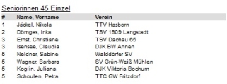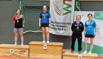Bei den Deutschen Senioren Meisterschaften in Hamm gewann Nikola Jäckel völlig überraschend den Titel im Damen Einzel Ü45. Trotz massiven Verletzungsproblemen, die sie zu einer mehrwöchigen Pause zwangen, konnte Nikola den Titel im Damen Einzel gegen die favorisierte Inka Dömges gewinnen. Nach dem souveränen Gruppensieg, musste sich Nikola im Viertel- und Halbfinale schwer strecken, um überhaupt das Finale zu erreichen. Hier drehte sie nach einem 0:2 Rückstand die Partie und wurde sensationell Deutsche Meisterin 2024 der Damen Ü45. Im Mixed Doppel an der Seite von Daniel Sporcic musste sie sich im Finale mit 1:3 gg Horst Geyer / Inka Dömges geschlagen geben und wurde Deutsche Vize-Meisterin. Im Doppel erreichte Nikola zusammen mit Karin Bißbort den 3. Platz und somit ebenfalls eine Medaille. Herzlichen Glückwunsch zu dieser erneut überragenden Leistung.