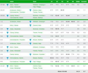 Gegen Wemmetsweiler musste unsere 1. Mannschaft in der Aufstellung Max Zimmer, Christoph Wilhelm, Florian Thome, Christian Bommer, Markus Klesen und Philipp Falk erneut eine bittere 9:7 Niederlage einstecken. Die Punkte für uns holten dabei das Doppel Max/Florian und in den Einzeln Max (2), Christoph, Christian, Markus und Philipp.