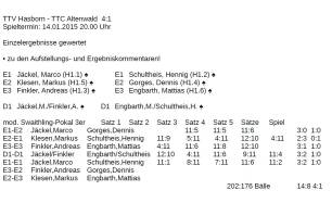 Punkten konnten hierbei Marco Jäckel mit 2 Einzeln gegen Gorges und Schultheis, Andy Finkler gegen Engbath und das Doppel Jäckel/Finkler gegen Schultheis/Engbarth. Den einzigen Gegenpunkt für Altenwald brachte das Einzel von Markus Klesen gegen Schultheis, das in 5 Sätzen verloren ging.